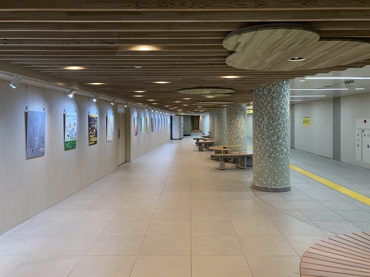 ホームからコンコース、出入口にかけては、御深井焼と同じ松灰を釉薬に使用するタイルを用い、土と火が生む自然な表情を現代の素材として再構築。コンコース天井にはエンボス加工を施したステンレス製鏡面パネルを配置し、水中にいるような光の揺らぎを表現した。さらに軌道部側壁には、手描きスケッチをアルゴリズムで変換したパネルパターンを施し、空間に自然のゆらぎを抽象的に映し出している。